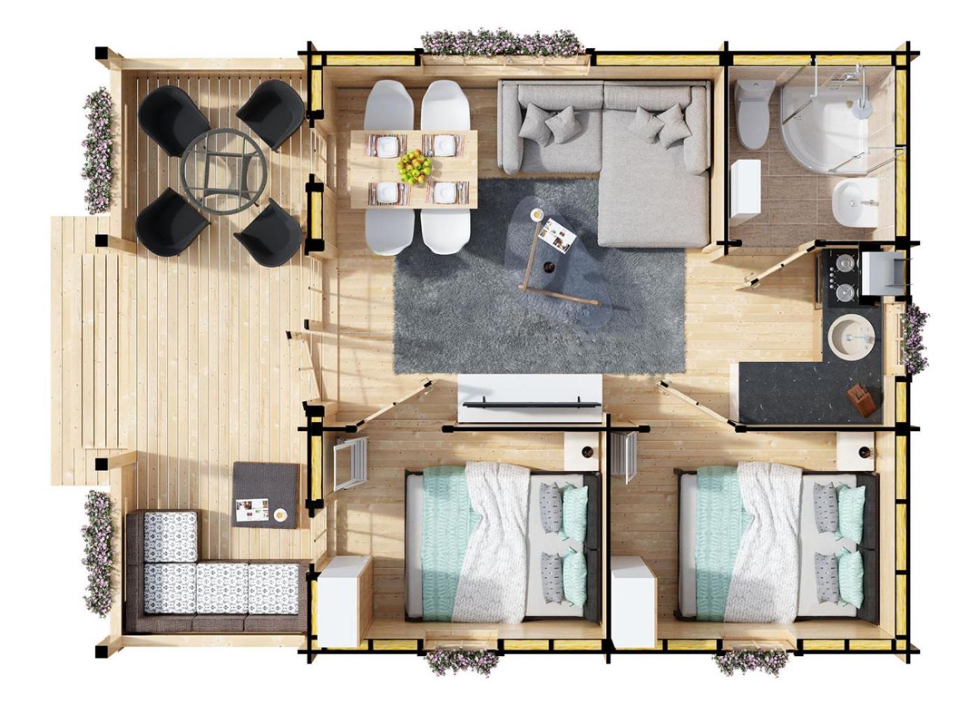 Domek z 2 sypialniami. Jest to klimatyzowany domek z prywatnym wejściem. Mieści on salon, 2 oddzielne sypialnie oraz łazienkę z prysznicem i suszarką do włosów. W kuchni przygotowano przybory kuchenne, kuchenkę mikrofalową, lodówkę i płytę kuchenną. Goście zatrzymujący się w tym domku mogą korzystać z grilla. Domek ten dysponuje tarasem z widokiem na ogród, częścią wypoczynkową oraz telewizorem z płaskim ekranem. Do dyspozycji gości są 3 łóżka. Domek - 6 osobowy. Powierzchnia pokoju ok.: 35 mkw. ;