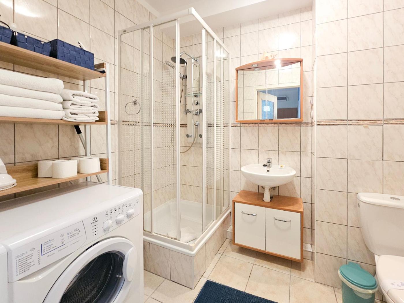 Apartament z 2 sypialniami i balkonem. This apartment comprises 1 living room, 2 separate bedrooms and 1 bathroom with a shower. Guests can make meals in the kitchenette that comes with a stovetop, a refrigerator, kitchenware and a microwave. This apartment features a washing machine, a coffee machine, a flat-screen TV and a balcony. The unit offers 3 beds. Apartament - 6 osobowy. Powierzchnia pokoju ok.: 50 mkw.